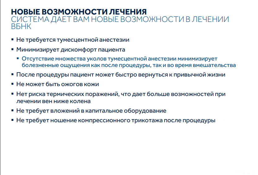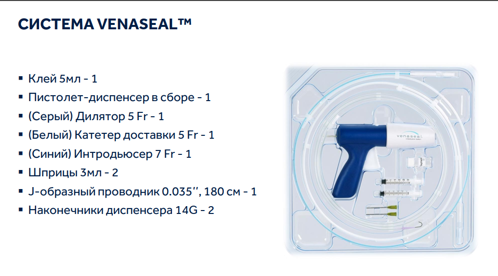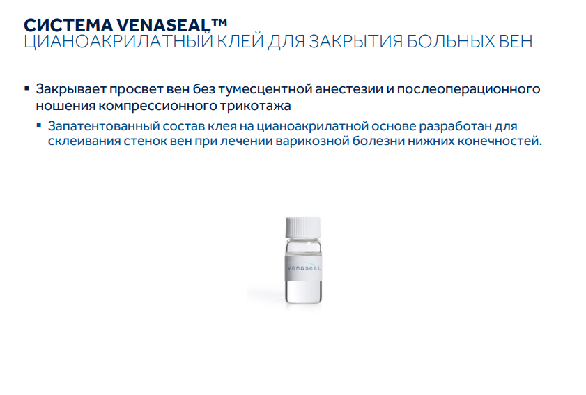 Система закрытия вен VenaSeal предназначена для постоянного полного эндоваскулярного закрытия биологическим клеем большой подкожной вены ноги (БПВН)